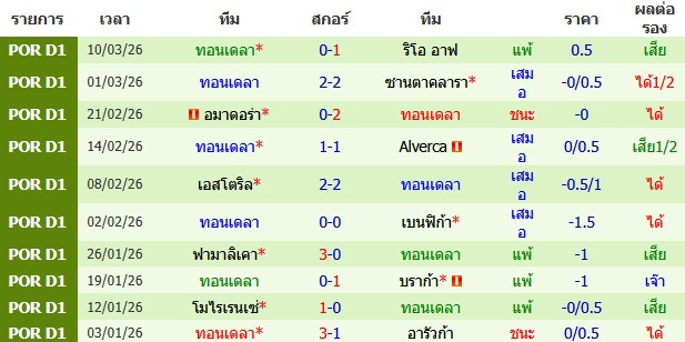 ผลงาน 10 นัดหลังสุดของทีม ทอนเดล่า